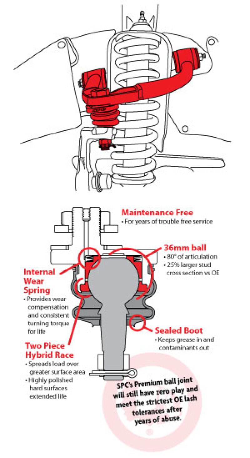 - SPC ball joints are oversized and provide 80 of travel