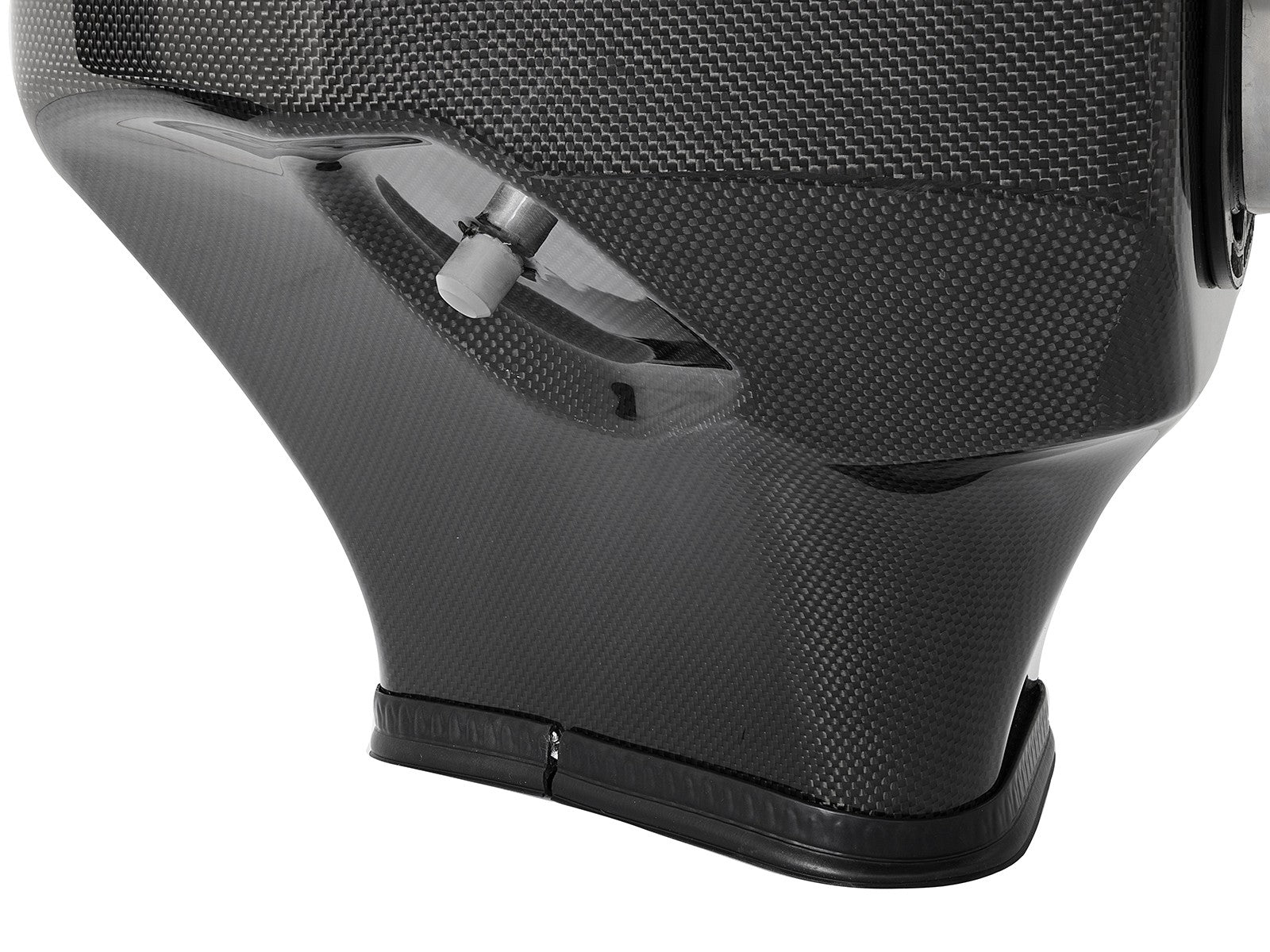 The simple yet elegant design of the one-piece sealed housing makes installation a snap and features our (Patent Pending) filter-to-housing interface. A large clear sight window allows for filter inspection without removal of the airbox. The housing is made out of lightweight high gloss, clear-coated plain weave carbon fiber and mounts directly into the factory headlamp cold air inlet location on the driverside to capture the coolest air available from the factory intake tract.