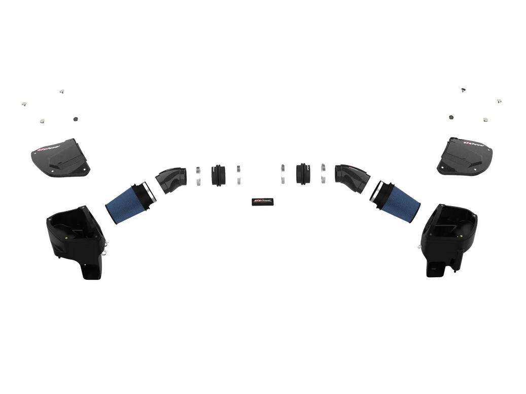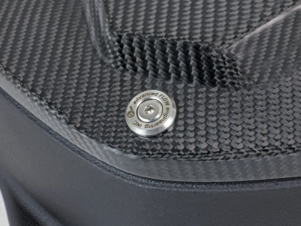 The air filters are surrounded by heat-resistant XLPE polymer housings. Covers, constructed from 100% twill weave carbon fiber, are secured to the housings with premium aFe POWER branded hardware - making for an aggressive style and simple air filter inspection.
