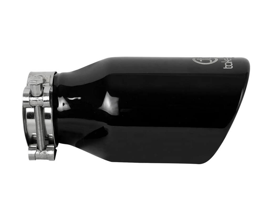 Improve your exhaust system by upgrading your exhaust tip with this Takeda 304 stainless steel, universal tip designed to fit most 2 1/2" exhaust systems. This 8" long, double-walled, slash cut exhaust tip has a high gloss black powder coated finish and a laser-etched Takeda logo for a custom look. Completely adjustable, the tip includes a quality stainless steel barrel band clamp for a secure fit and there is no modification or welding required.