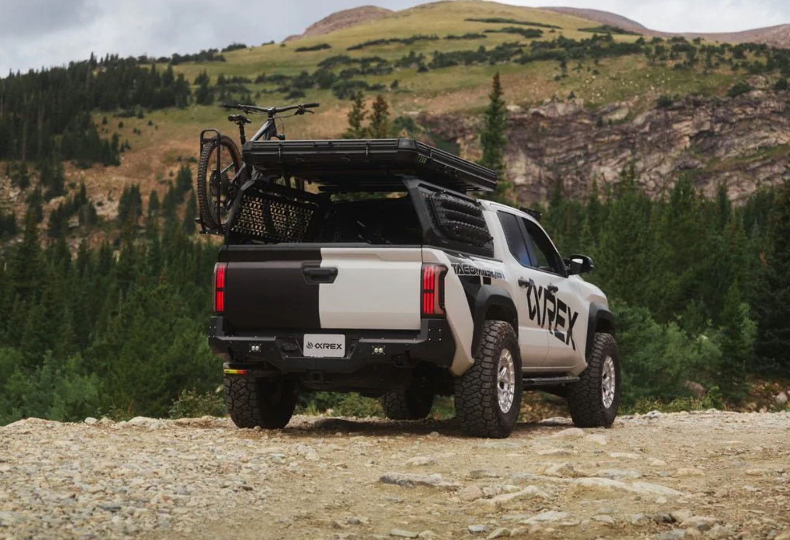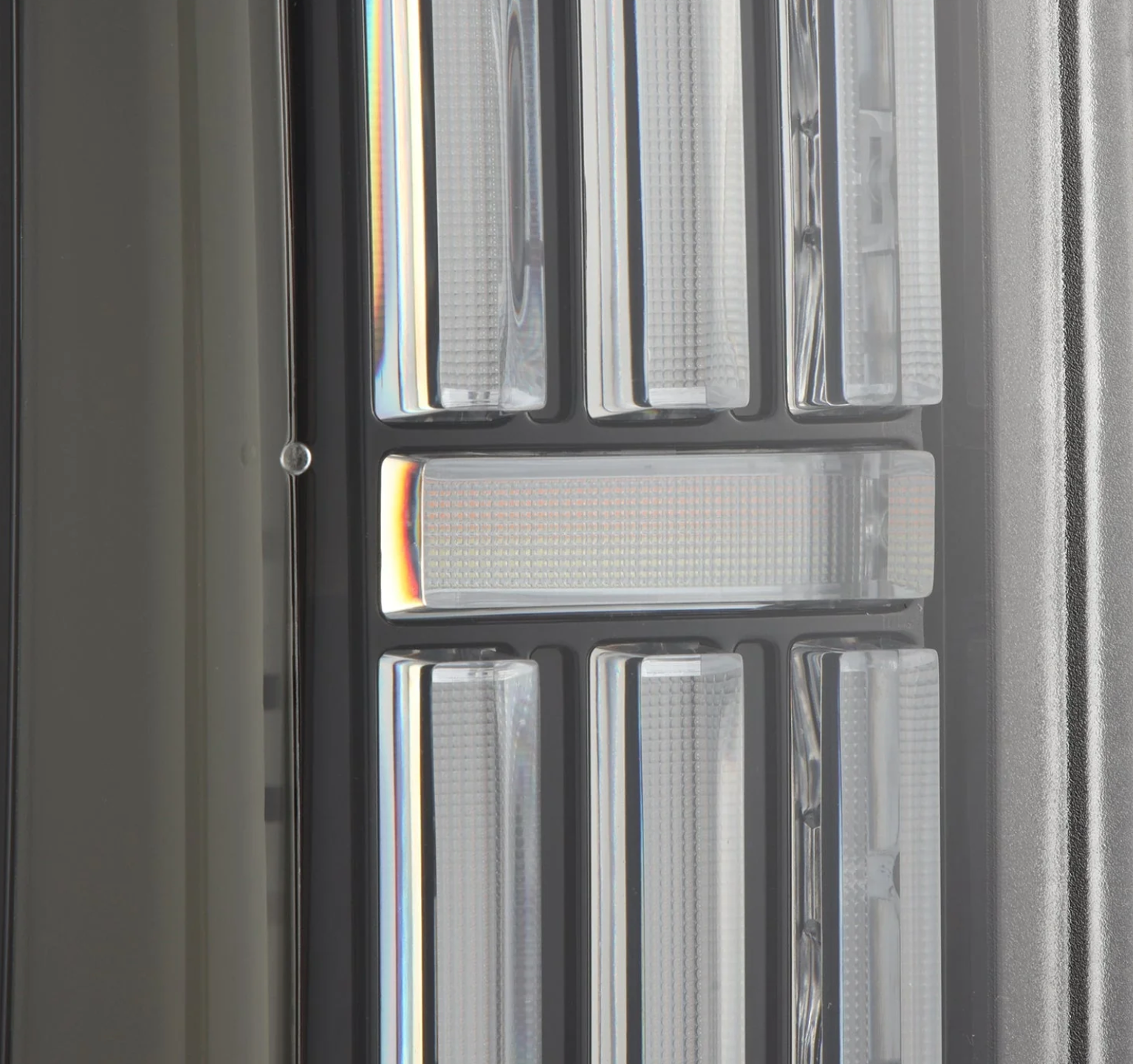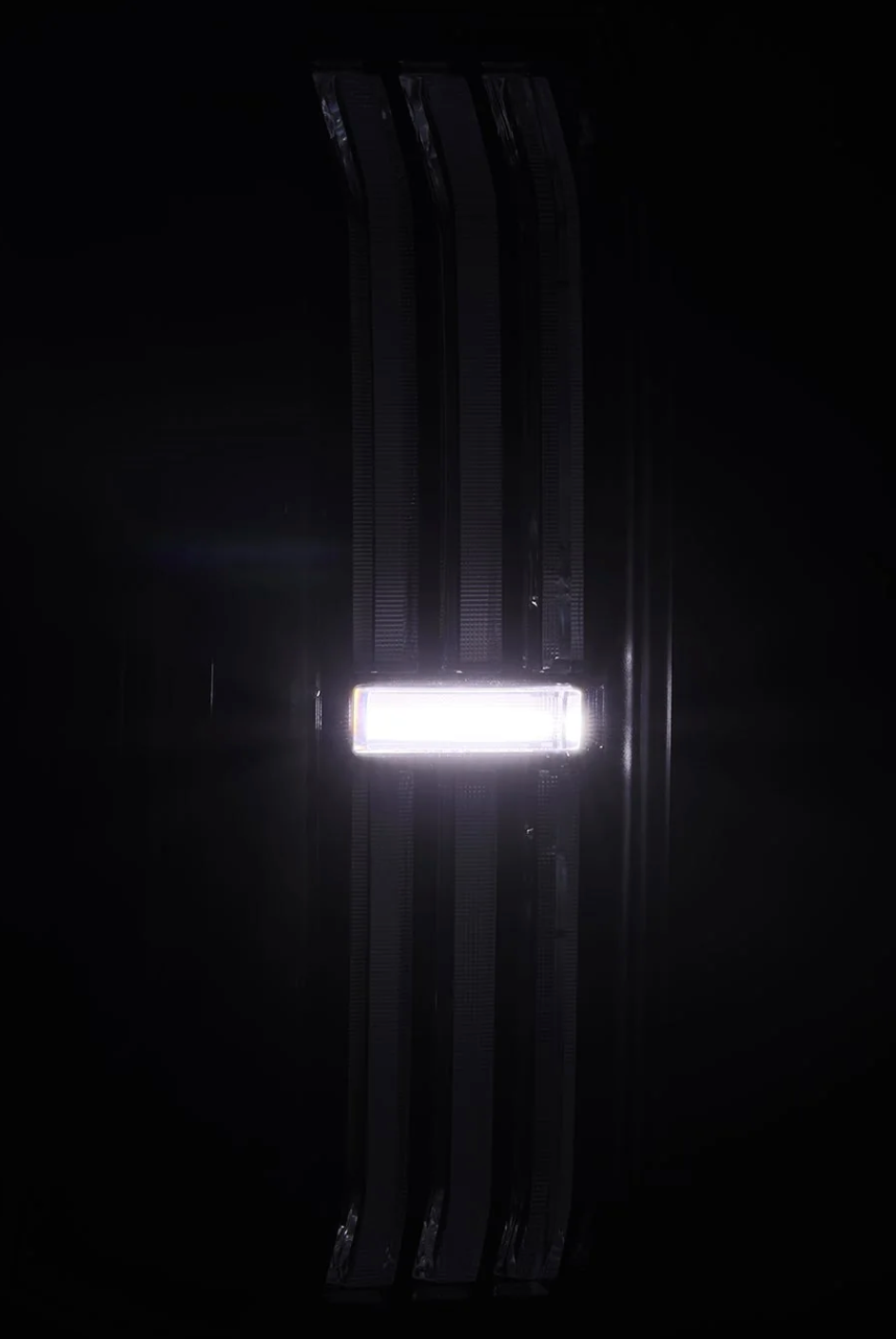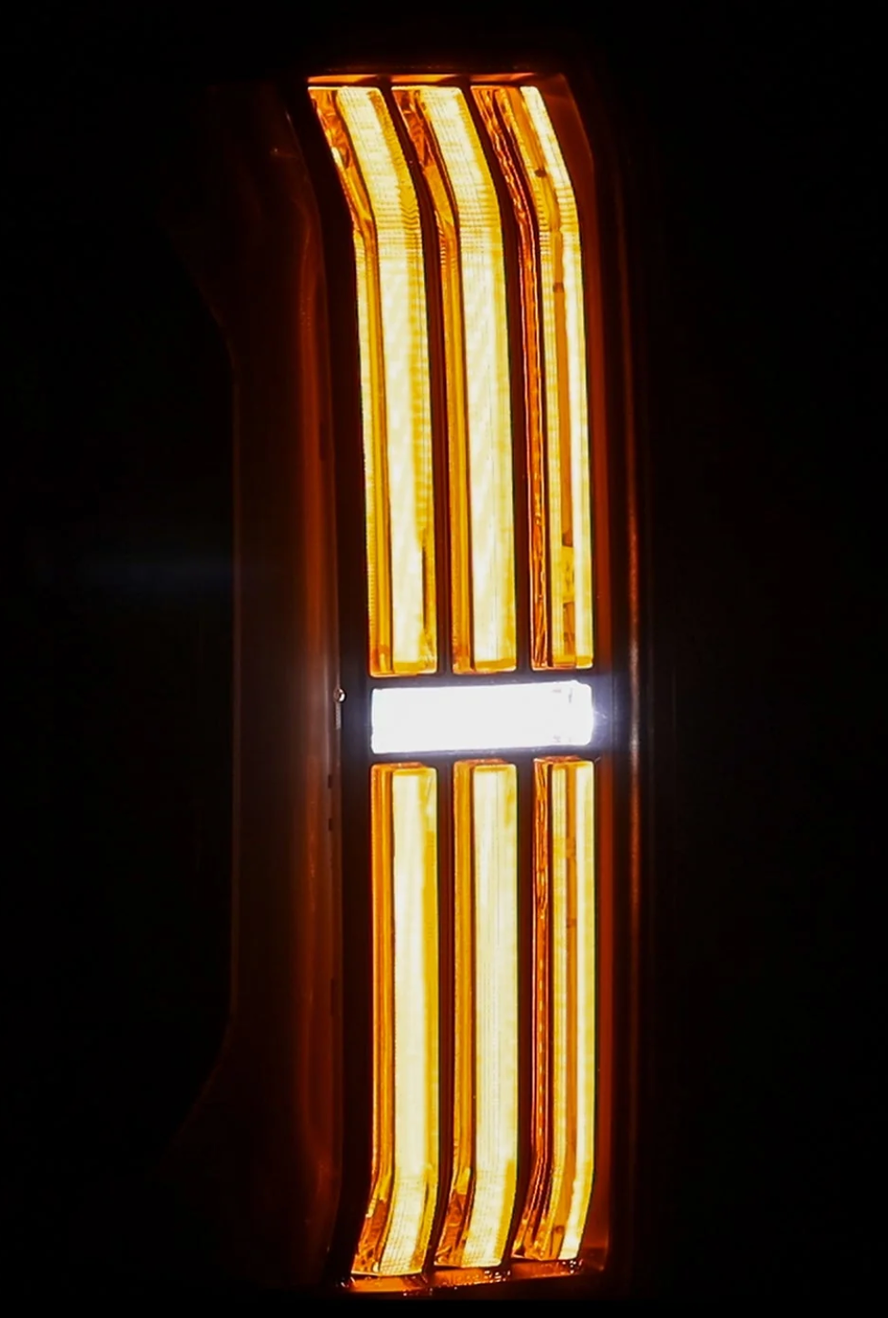 The trapezoidal prisms illuminate with red LEDs for parking lights, intensifying when braking. For turn signals, amber LEDs activate across the prisms and the LED side panel in a dynamic sequential flow, adding a modern touch. The side LED tube mirrors the signature look of the 3rd Gen Tundra, providing additional parking light functionality, while the central LED tube lights up with white LEDs as a reverse indicator.