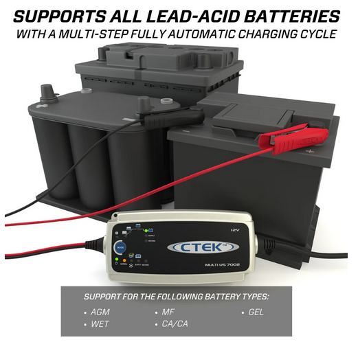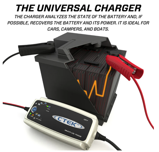 A NEW GENERATION of CTEK universal charger, the MULTI US 7002 has a unique 8-step charging curve. This new refined technology developed by CTEK ensures that the vehicle's battery gets the best possible care. It even analyzes if the battery can hold the charge given. If it cannot, the battery is faulty and needs to be replaced. The CTEK chargers are developed for safety: personal, vehicle and battery.