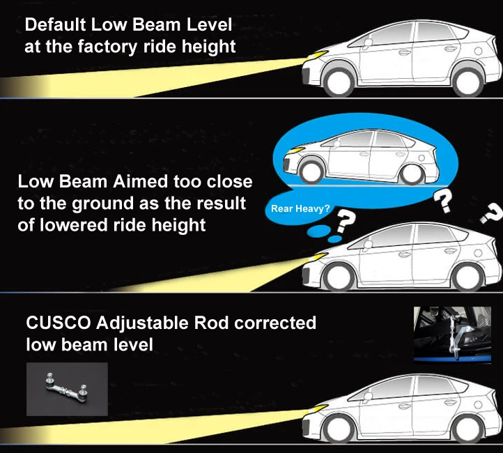 - In order to correct those symptom, CUSCO introduced the Adjustable Rod for Headlight Level Adjuster. It is easy to reset the appropriate headlight level. In some cases, the ECU can utilize the headlights level according to its vehicle height; however, there are parameter limitations for electronic sensors and it will eventually require a mechanical adjustment.