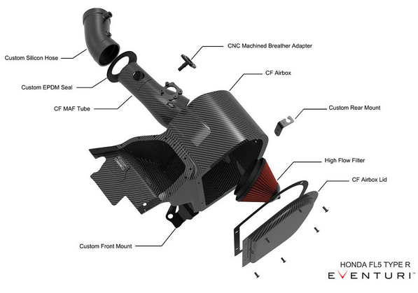 The Eventuri FL5 Type R intake system consists of a number of components engineered to perform a specific purpose and fabricated to the highest of standards.