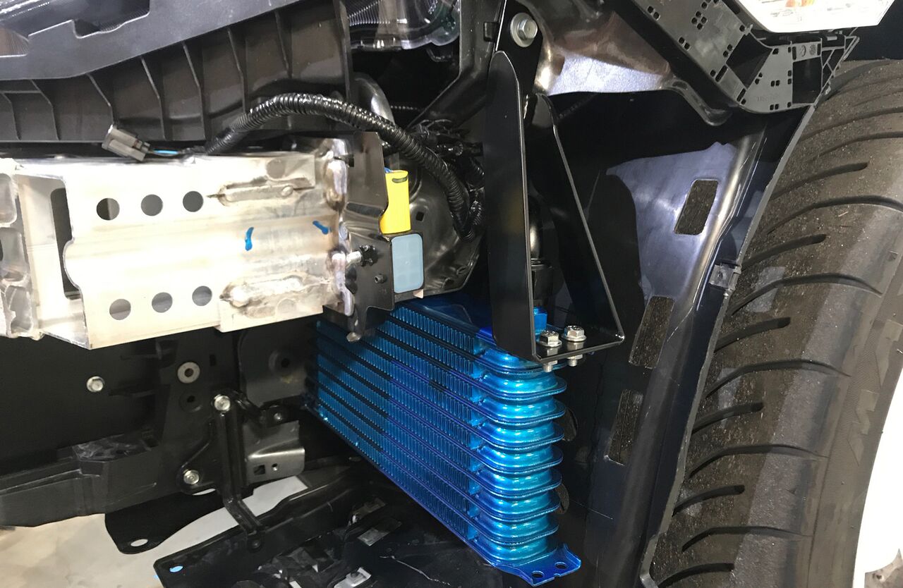 NS1010G - 10row GReddy Oil Cooler with -10 XRP lines. Mounts behind left side of the front bumper M20xP1.5 GREX Oil Block Adapter with built in thermostat and ducting plate, brackets, hardware.