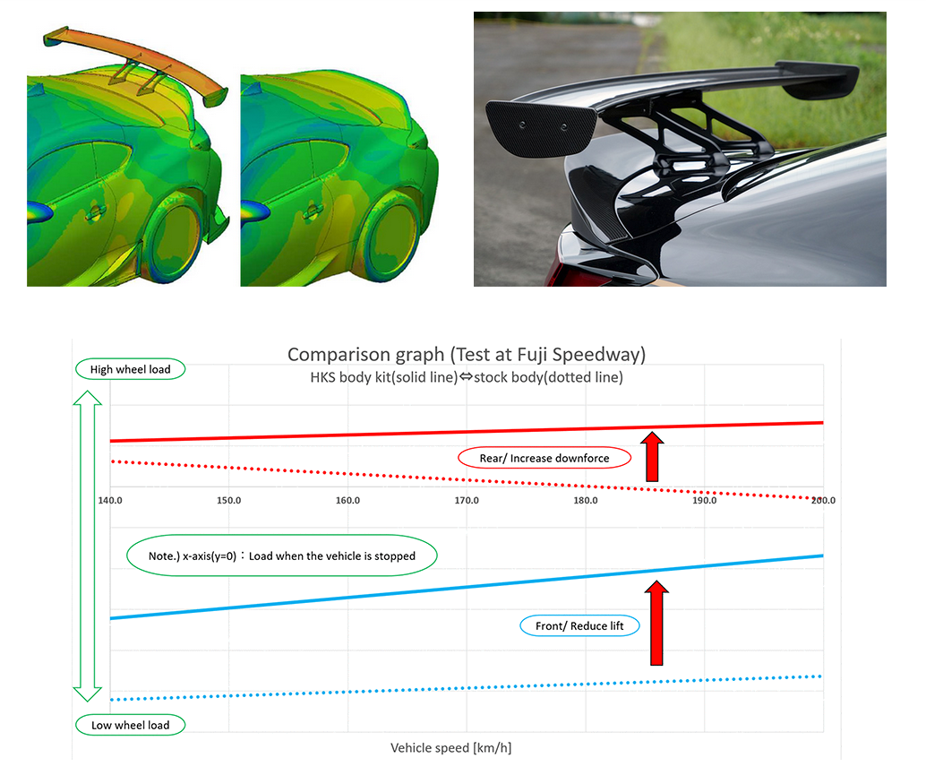 - Test with the rear wing and aero kit shows the kit reduces the understeer and provides stability while cornering, suppressing the fluttering during full braking in the meantime, and improves the tire traction. The driver can entirely experience all the improvements on driving stability.