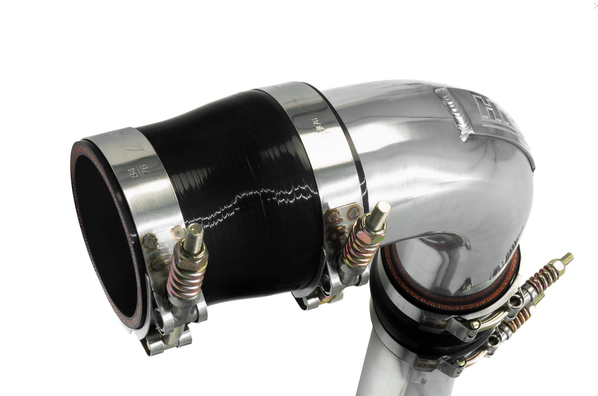 This HPS Performance Polished Hot Side Charge Pipe Kit (Part Number 17-146P) with ultra high temperature silicone boots is a simple and effective replacement and performance upgrade from the L5P Duramax restrictive stock intercooler piping (hot side). The 2017-2019 Silverado/Sierra 2500 and 3500 trucks stock intercooler piping is a known weak point in the Duramax's powertrain. With OEM replacements constantly on backorder, a solution for this issue had to be put in place. Replace your defective stock part with an upgrade that won't leave you stranded. Enjoy increased long-term reliability, quicker acceleration, and easier towing. HPS Charge Pipe Kits emphasize easy installation in its design by utilizing 3D modeling during the product's development to ensure a perfect fit. This two-piece kit allows for easier installation while taking into consideration the dynamics under the hood. The larger 3" OD mandrel-bent aluminum piping offers increased air volume and improved airflow. This charge pipe kit includes HPS oil resistant high temperature 4-ply reinforced silicone couplers and heavy duty stainless steel spring loaded T-bolt clamps.