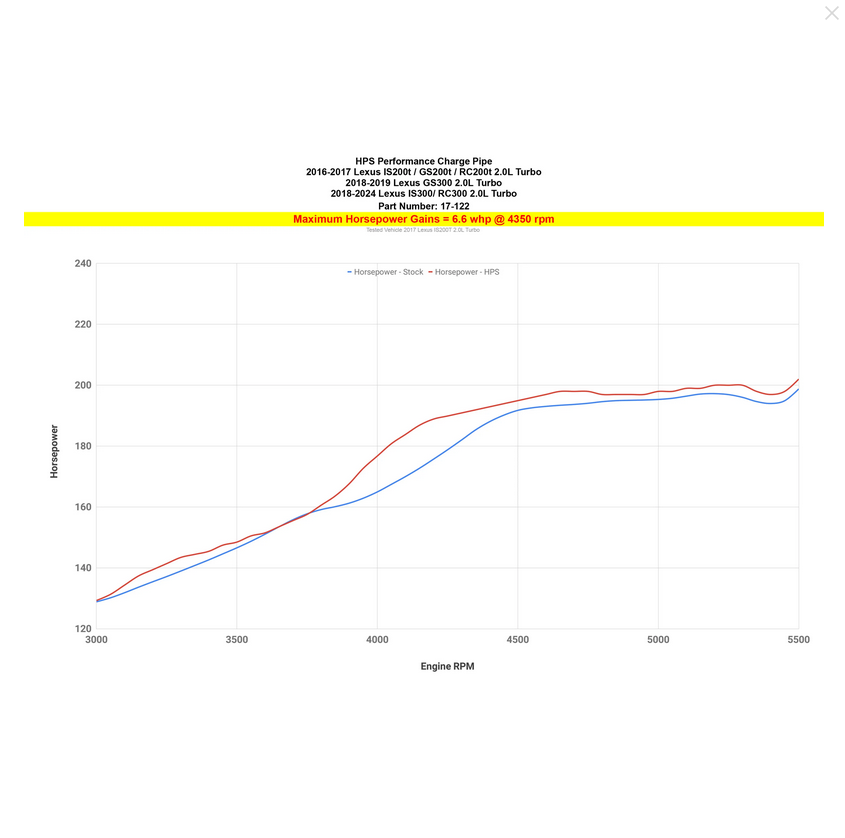HPS Performance Intercooler Charge Pipe Hot Side (part number: 17-122) is a simple yet effective performance upgrade for 2016-2017 Lexus IS200t 2.0L Turbo oem restrictive plastic intercooler piping. HPS R&D team reverse engineered the original part to offer a product that ticks all of the boxes; Durability, Performance, and Style. Made from lightweight mandrel bent 2.5" aluminum tubing, the charge pipe kit has less bend and better air flow compared to the oem restrictive design. The bead rolled pipe ends prevent couplers from popping off under boost. It has HPS industrial grade high temperature 4-ply reinforced oil resistant floruolined silicone coupler and heavy duty 100% stainless steel t-bolt clamps to secure the connection. The kit includes a custom made bracket to reinforce the connection (for which you will not find from other charge pipes). HPS turbo charge pipe also includes 1/8" NPT bung to give you the option of running methanol injection or boost gauges (even nitrous systems). Installation can be completed in 90 minutes with basic hand tools and does not require permanent modification or ECU reflash.The intercooler piping kit optimizes and smooth out the air flow, increase horsepower +6.6 Whp , torque +9.1 Ft/lbs and improve throttle response without re-tuning the ECU.