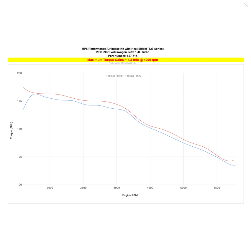 Designed with style and performance in mind, HPS Performance Air Intake Kit with Heat Shield (part number 827-714) replaces 2019-2021 Volkswagen Jetta 1.4L Turbo restrictive stock intake tubing and air filter housing with a 3" mandrel-bent aluminum tube designed for your vehicle and includes a reusable high-flow cotton air filter for maximum power gains. Enjoy better throttle response and improved acceleration as your engine comes to life, delivering an additional 4.9 horsepower and 4.2 lb-ft. of torque! The heart of this kit lies in its reusable high flow cotton air filter and 3 inch mandrel-bent aluminum intake tube that are designed to optimize airflow and minimize restrictions for maximum performance. Coupled with a reinforced silicone reducing coupler and 100% stainless steel T-bolt clamps, this kit ensures a secure fit, preventing any leaks or disruptions regardless of operating conditions. The custom powder coated steel heat shield works to maintain a consistent, cool air supply to your engine by isolating the air filter from radiant heat from the engine. This easy to install kit requires a few basic tools and absolutely no modifications to effortlessly enhance your time on the road.