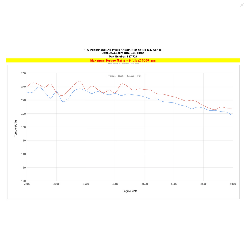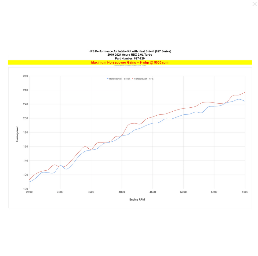 It's time to ditch the 3rd Gen RDX restrictive stock air intake and filter! This HPS Performance Air Intake Kit with Heat Shield (part number 827-729P) replaces the restrictive stock intake with a 3.25” mandrel-bent aluminum intake tube to improve air delivery to the engine. The stock air filter and air filter housing is replaced with a high-performance reusable high-flow cotton air filter and a specially designed heat shield to direct air flow to your intake. The heat shield features a specially designed pattern so you can hear that sweet turbo spool under hard acceleration while retaining the effectiveness of the heat shield. Experience improved acceleration and throttle response with dyno proven gains of 9 horsepower and 9 lb-ft. of torque. Engineered to perform even under the toughest driving conditions, HPS Performance Air Intake Kits are built with durable high temperature resistant reinforced silicone couplers and 100% stainless steel embossed clamps. Installation is a breeze - you only need basic hand tools and no additional modifications are required.
