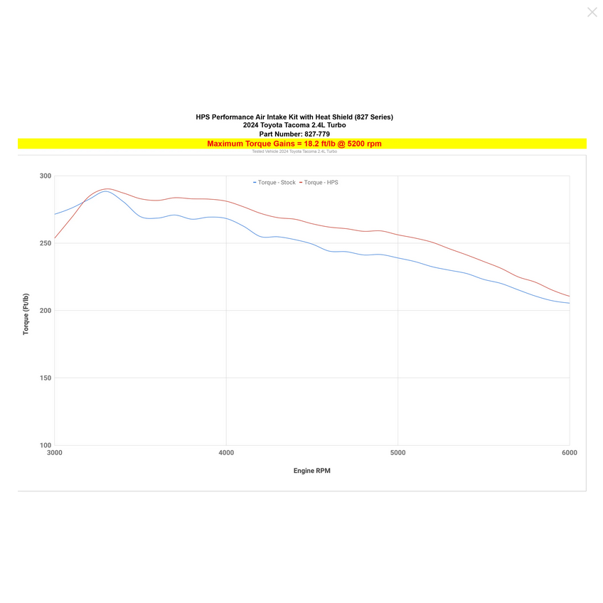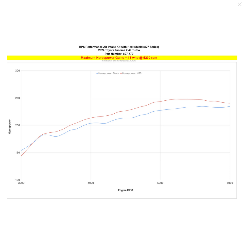 HPS Performance Air Intake Kit with Heat Shield (Part Number 827-779) upgrades the stock intake and air box to uncover your 2024 Tacoma 2.4L Turbo engine’s untapped power potential. Dyno-tested and proven, this system delivers a substantial power boost of 18 horsepower and 18.2 lb-ft of torque. Feel the difference with sharper throttle response and reduced turbo lag, transforming your daily drive into an exhilarating experience. The 3" intake pipe replaces the restrictive factory plastic intake hose with a smooth, mandrel-bent aluminum pipe, allowing your engine to breathe freely and efficiently. This upgrade not only optimizes airflow but also enhances the overall sound of your Tacoma's engine.