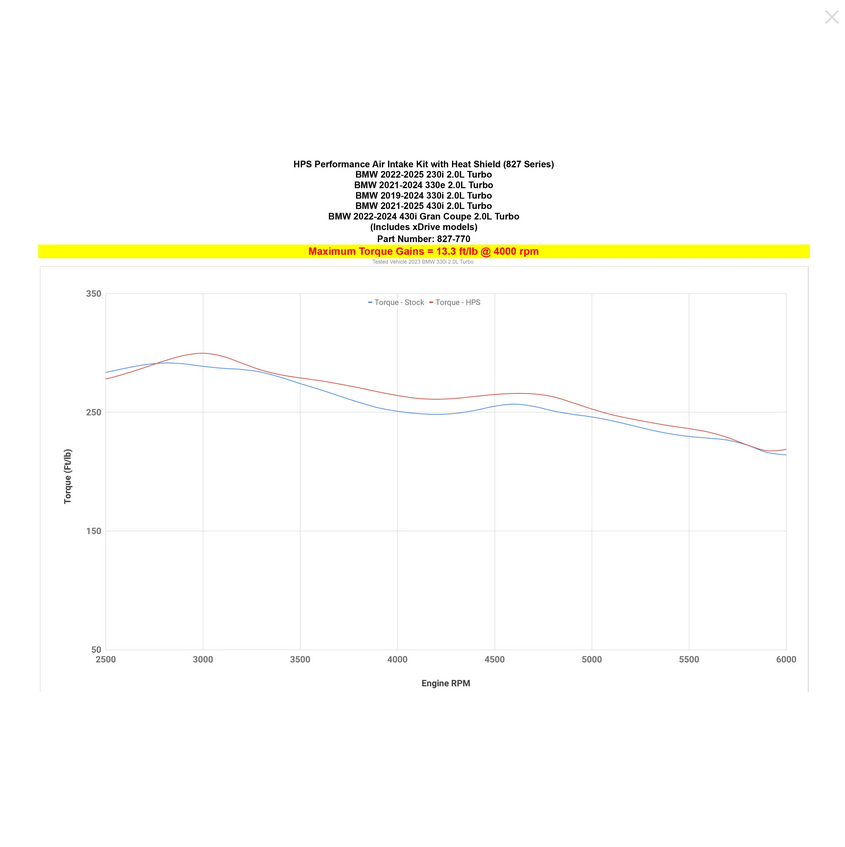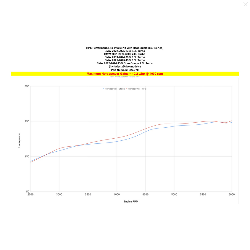 HPS Performance Air Intake Kit with Heat Shield (part number 827-770) is designed to elevate your BMW 230i B48 Turbo driving experience to new heights by delivering dyno-proven gains of 10.2 horsepower and 13.3 lb-ft. of torque. This premium kit boasts a sleek 3.25" aluminum intake tube, engineered to deliver smoother airflow than the restrictive stock system. Breathe life into your BMW B48 engine with the high-flow washable and reusable pre-oiled cotton air filter, ensuring maximum airflow and filtration efficiency. The included powder-coated steel heat shield with lid safeguards your intake from under-hood heat, optimizing performance. Unlock the perfect blend of power and precision with an HPS signature high-temperature and pressure-resistant reinforced silicone coupler and stainless steel hose clamps, guaranteeing a secure and leak-free connection. The kit's comprehensive design includes all the necessary hardware, allowing for a straightforward installation without any additional modifications or tunes.