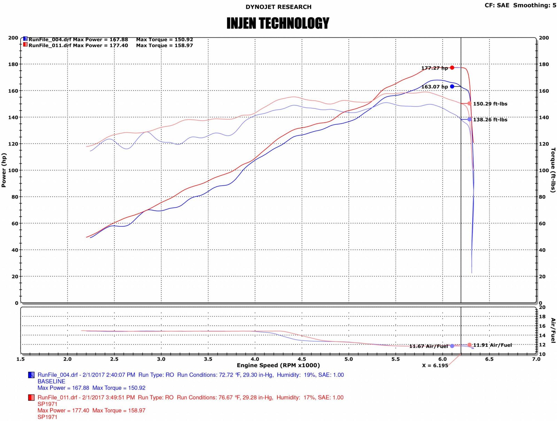 The soul of this intake is found within 6061-T6 aluminum air intake tube that provides a smooth uninterrupted path for highly efficient airflow. Our engineers have painstakingly designed the intake to provide the highest levels of safe power, along with clean aesthetics that will impress every time you open your hood. In addition to the impressive power increase, the Injen team has ensured that a safe Air fuel (A/F) ratio has been maintained throughout the power band.