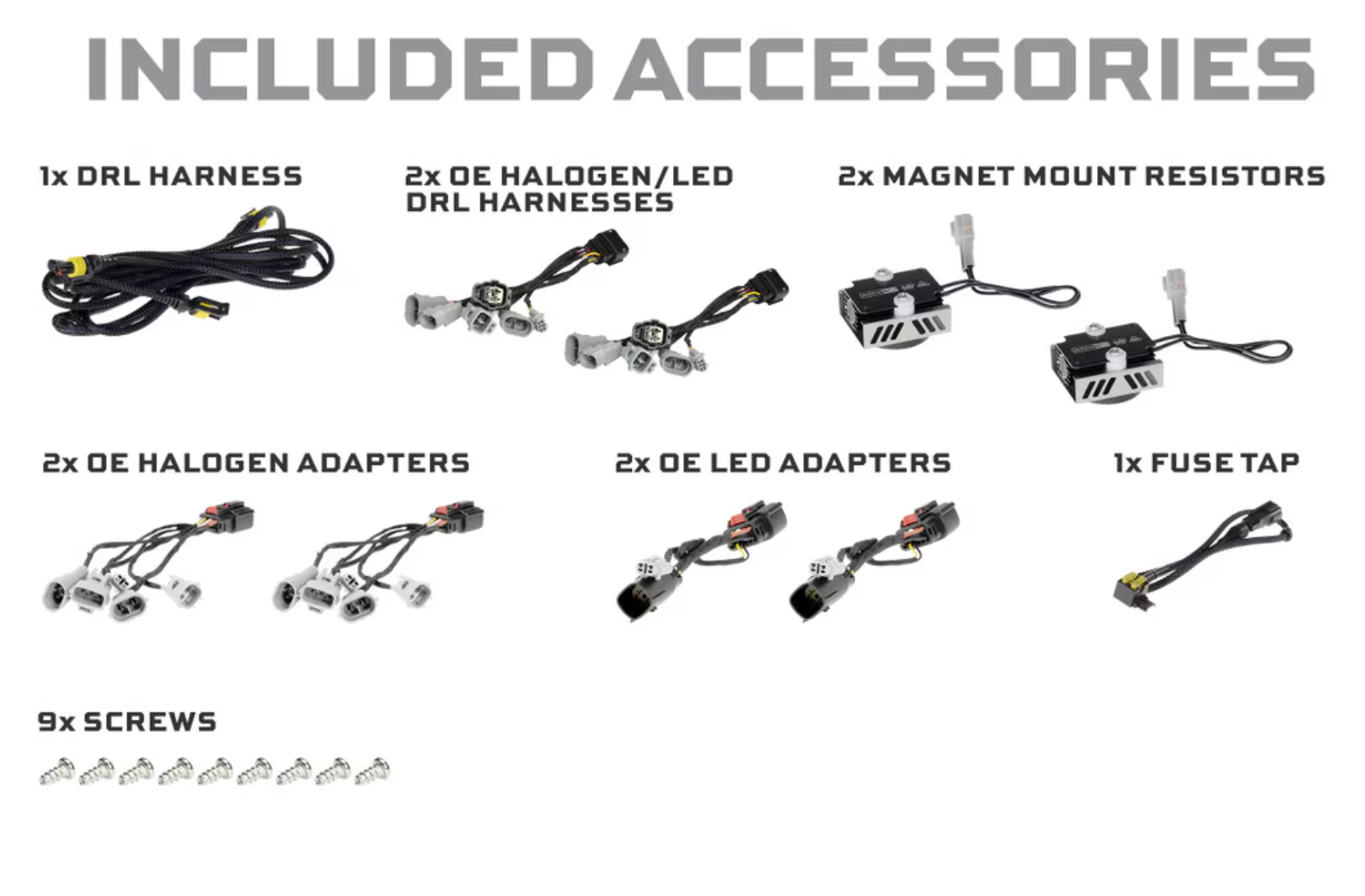 Wiring: 2x Halogen Adapters, 2x LED Adapters, 2x Magnet Mount Resistors, 1x DRL Harness, 1x Fuse Tap, 9x Screws