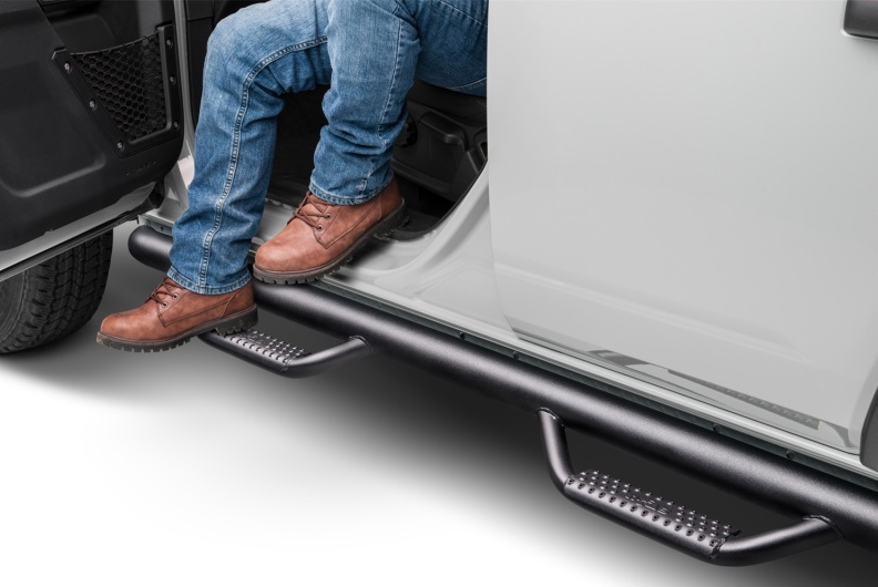 Drop down step design and location is engineered to allow for ease of access on stock or lifted vehicles.
