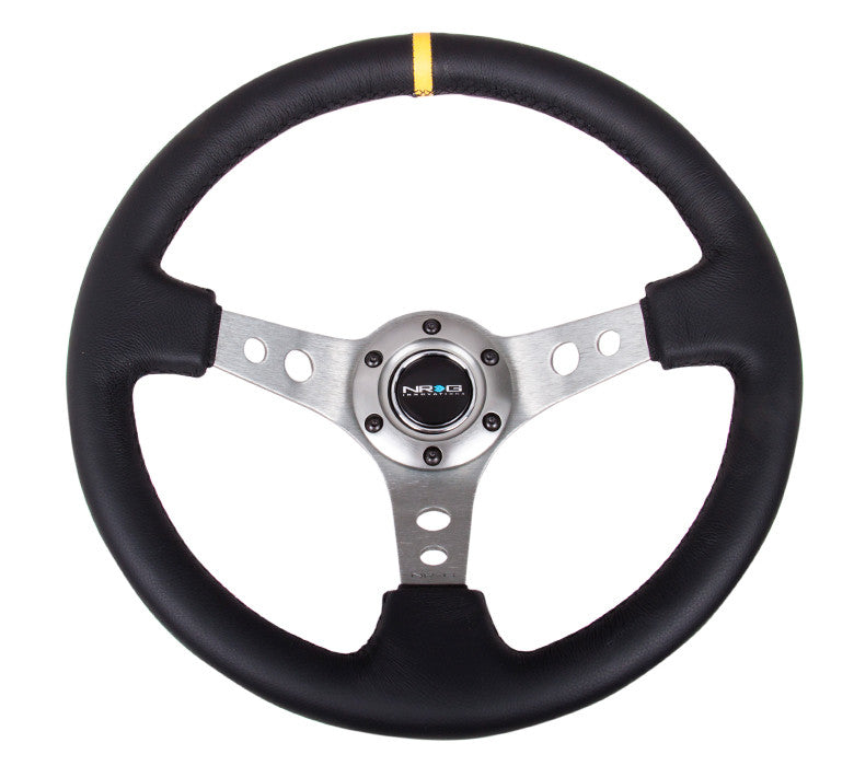 NRG ST-006 Series Steering Wheel (3" Deep) Black Leather, Gun Metal 3 Spoke, Yellow Center Marking (350mm)