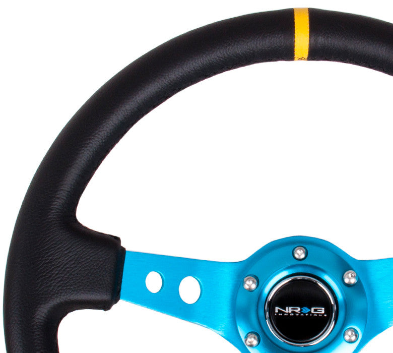 NRG ST-006 Series Steering Wheel (3" Deep) Black Leather, New Blue 3 Spoke, Yellow Center Marking (350mm)