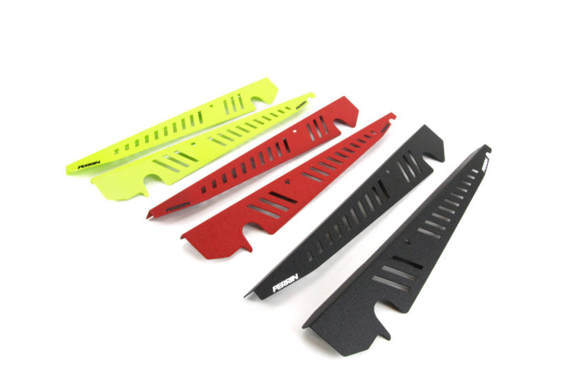 Change the look of the engine bay in your 2015+ Subaru WRX/STI with a set of PERRIN Performance Fender Shrouds. These shrouds are CNC laser cut from 6061 plate aluminum and finished with a durable powder coating. They are available in either red or black textured finish or glossy neon yellow. The angled cutouts match the PERRIN Performance pulley covers, so they will fully complete the look of your engine bay while concealing the factory fender gap.