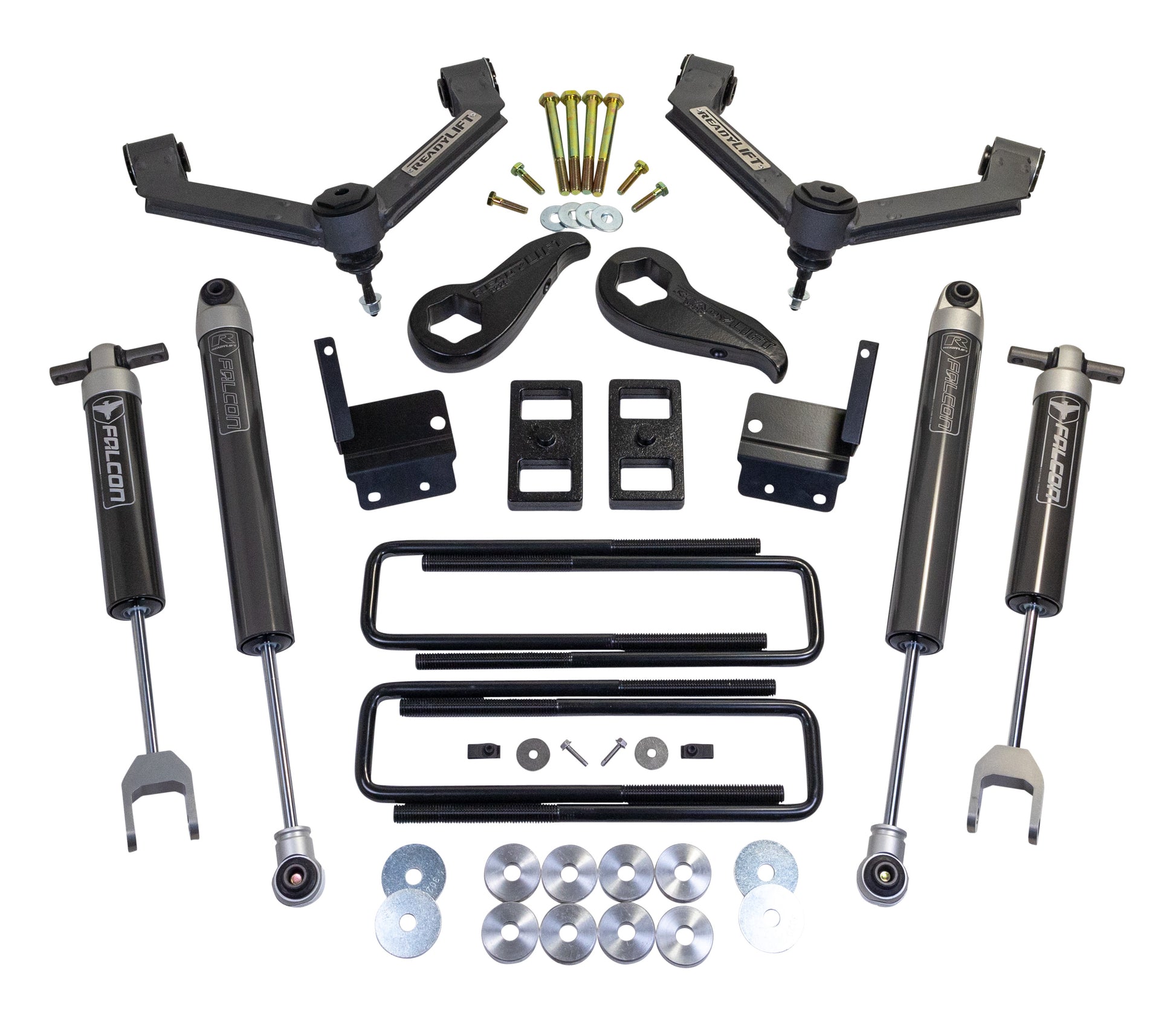 This 69-30320 system provides a 3" front lift with forged torsion keys coupled with re-engineered heavy-duty fabricated 4130 chromoly steel upper control arms including all-new heavy-duty high angel ball joints and maintenance-free TCT non-bonded pivot bushings. In the rear, ReadyLIFT provides lift blocks for a lifted, level stance that retains factory load capacity, while all four corners of the truck receive Falcon 1.1 Monotube shocks to deliver the best-lifted ride quality available.