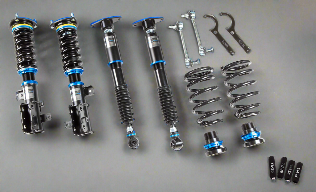 We are excited to announce the next product in the Revel USA lineup! The Touring Sports Damper offers you a sporty yet compliant ride that will enhance your driving experience to new heights. A full case length threaded monotube damper give you greater ride height range and 32 levels of dampening adjustment allows for fine tuning of the ride characteristics. Pillowball upper mounts are included when available as well as Teflon thrust washers to reduce spring binding during suspension movement.