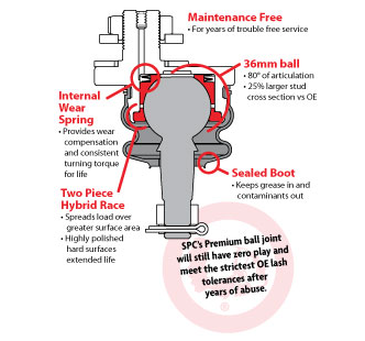 Get more droop travel: SPC’s arm has improved clearance to get around the spring bucket. With 80° of articulation in the new maintenance free ball joint and free pivoting bushings, SPC's arm gives you maximum droop travel.