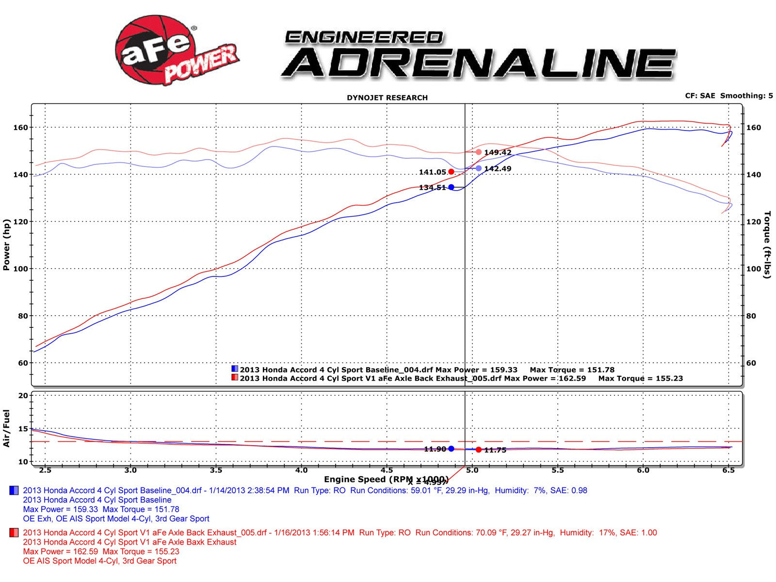 aFe is proud to introduce the new Takeda Axle Back Exhaust System for the 2013-2017 Honda Accord Sport Sedan L4-2.4L. In recent testing this system produced 7 horsepower and 7 lbs. x ft. of torque. This exhaust starts out with an OE style flange and uses 2.25" tubing that merges into dual 1.75" tubing which improves performance across the power band while maintaining a great tone. TIG-welded and brushed finish mandrel bent 304 stainless steel for maximum strength and durability, this system is equipped with dual high flow, polished mufflers for maximum flow and performance. To finish off this exhaust are dual laser etched, double wall, angle cut 304 stainless steel tips. This exhaust uses all factory hanger locations for a hassle free installation. No modifications necessary.