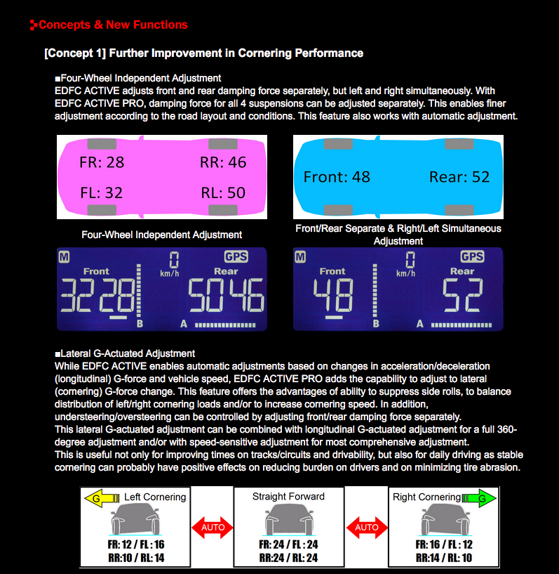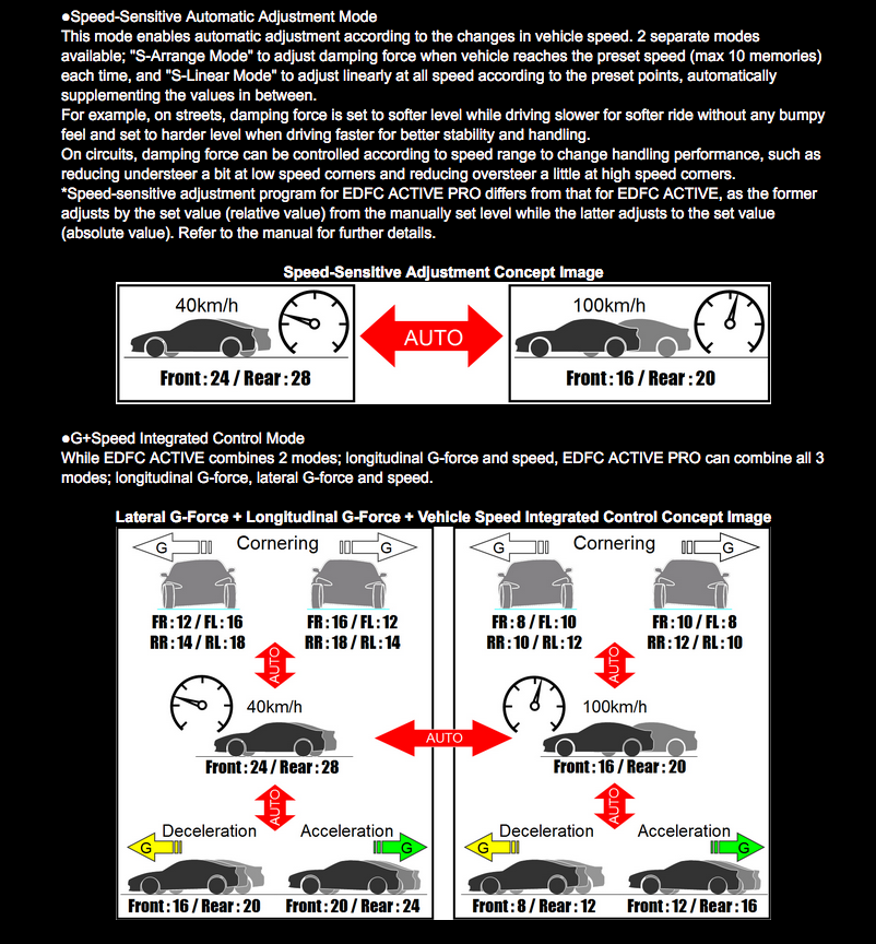 EDFC ACTIVE PRO is a high-spec version of EDFC ACTIVE, which enables automatic adjustment of damping force according to the changes in longitudinal G-force and vehicle speed, and comes with new and upgraded functions.