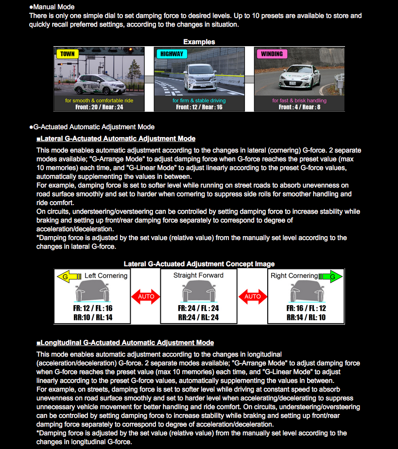 | For people who do not want G-actuated adjustment to work and/or do not like the motor sounds while driving at low speed, we added the function to set the minimum speed at which G-actuated adjustment to start working. Starting point can be set between 0 to 50km/h (or 0 to 50MPH) and G-actuated adjustment would not work when the vehicle speed is below such set value. |