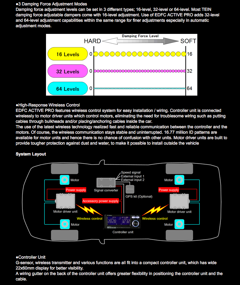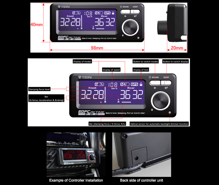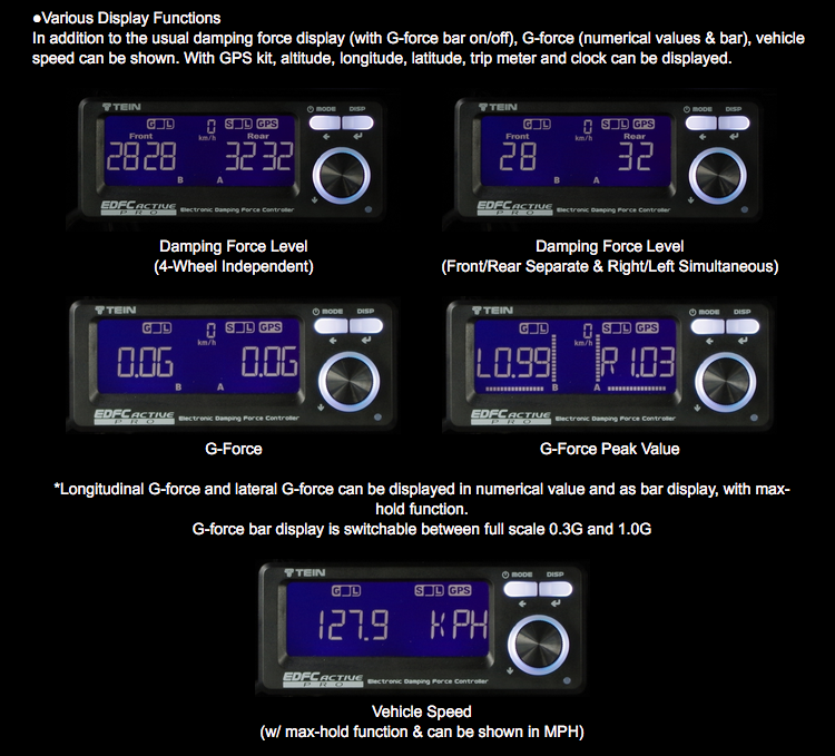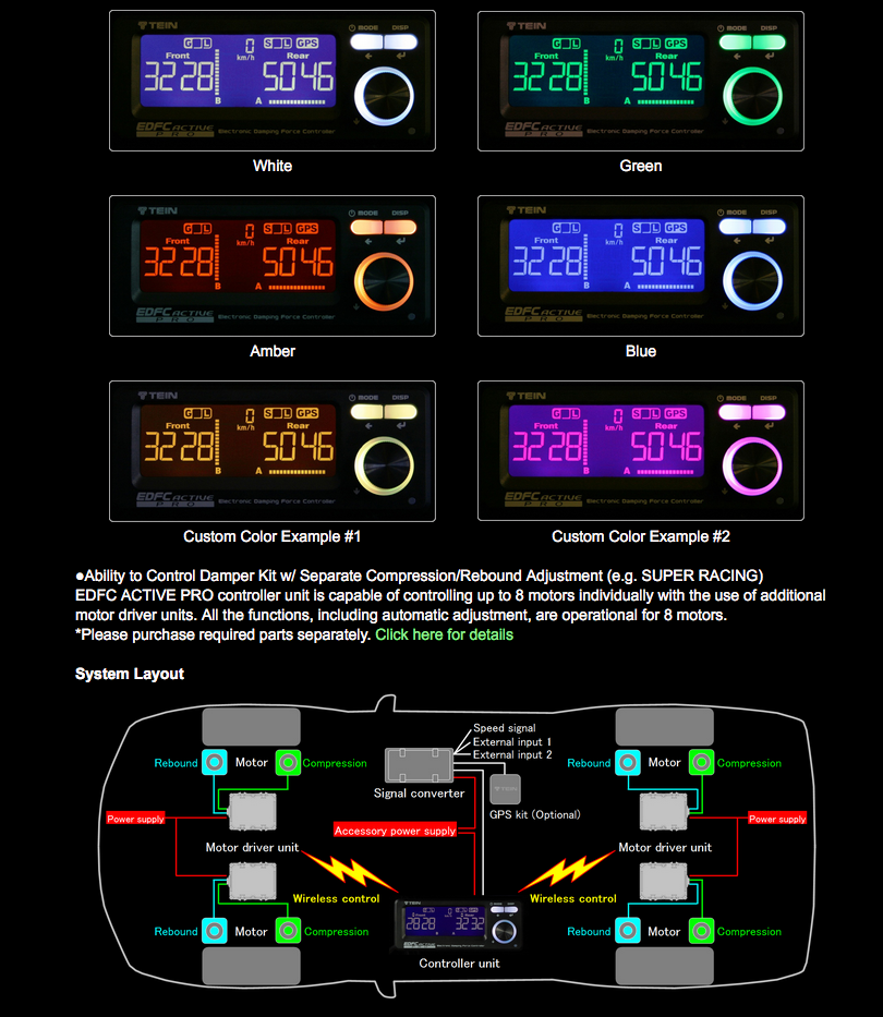 Newly-added features, such as individual adjustment of 4 shock absorbers, lateral (cornering) G-actuated automatic adjustment, vehicle speed pulse input and 2 additional input ports to communicate with drivers, are sure to bring out the full potential of each shock absorber as well as the vehicle itself. Please enjoy another dimension of shock absorber performance that EDFC ACTIVE PRO brings. (Patent Pending)