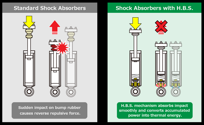 Standard Shock Absorbers with Bump Rubber, Upward jolts & rebound occur. Upward jolting and repeated bouncing, driving over a bump. It takes a while to stabilize. Shock Absorbers with H.B.S, such as RX1 absorbs smoothly! The impact is absorbed; no bouncing & rapid stabilization. Even in a fully seated & loaded minivan, jolts from the rough road are reduced. Ride comfort can be enjoyed in all seats!