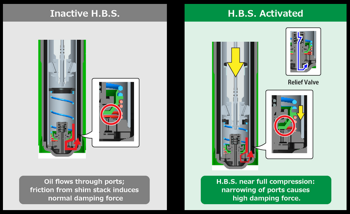 Near full compression, when the piston rod strokes beyond a predetermined point, the operative valve is pushed down and activates H.B.S.: the base valve ports are narrowed, blocking the oil flow. This results in high damping force.