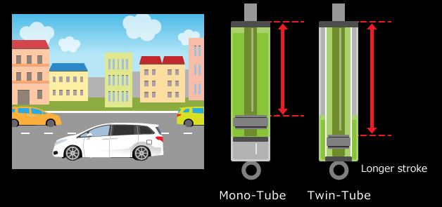 Compared to the regular mono-tube system, twin-tube attains longer strokes with a smaller repulsive force, resulting in high ride comfort.