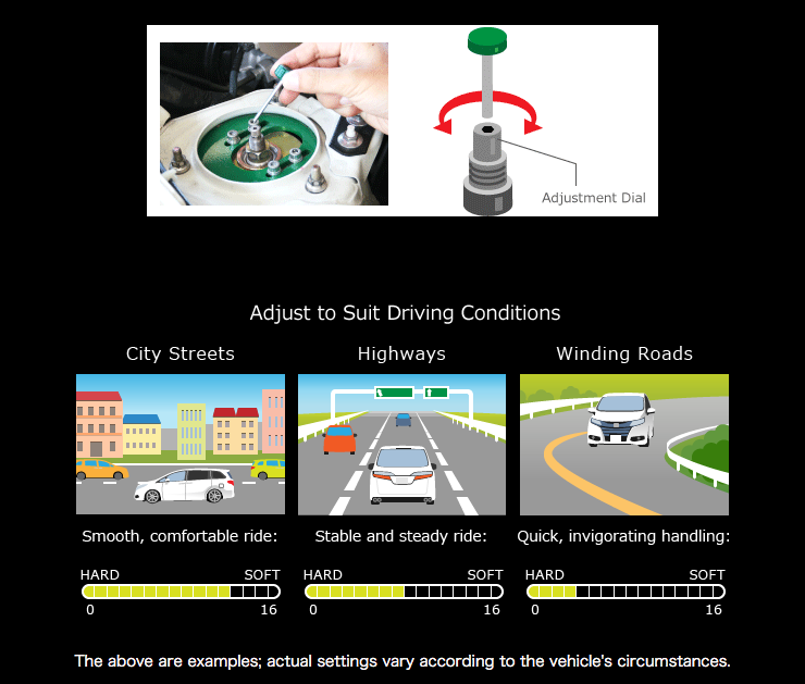 This entails changing damping force to suit your driving conditions or preferences, by re-arranging the shock absorbers' internal components.