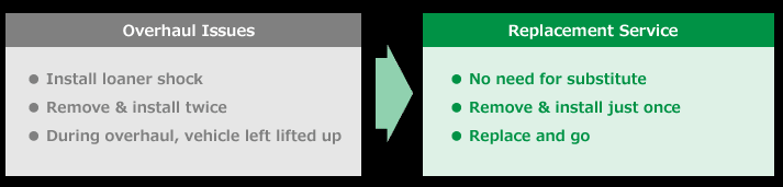 Our replacement service revives your shock absorber, by replacing the main part. It allows you to buy the shock absorber itself without the exterior parts like the upper mount, lower bracket, spring, etc.